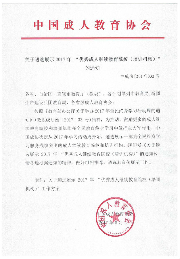 关于遴选展示2017年 “优秀成人继续教育院校(培训机构)”工作方案