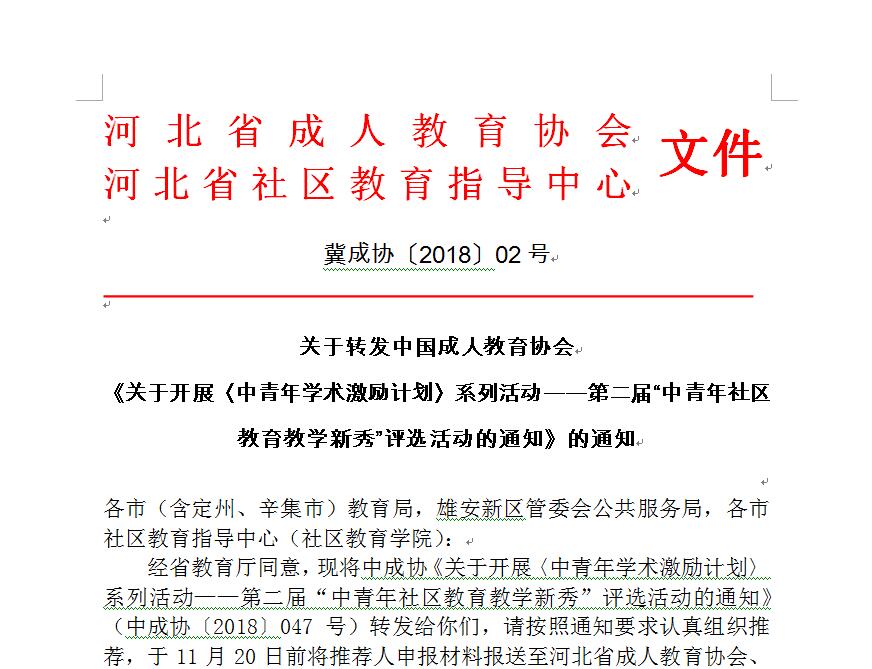 为建立和完善人才激励机制,加强社区教育师资队伍建设,培养社区教育教学骨干,促进中青年社区教育工作者迅速成长,经中国成人教育协会会长办公会议研究,中国成人教育协会决定于2018年9-12月组织开展《中青年学术激励计划》系列活动---第二届“中青年社区教育教学新秀”评选活动。现将《第二届“中青年社区教育教学新秀”评选办法》(以下简称《评选办法》)印发给你们,并就有关事宜通知如下: