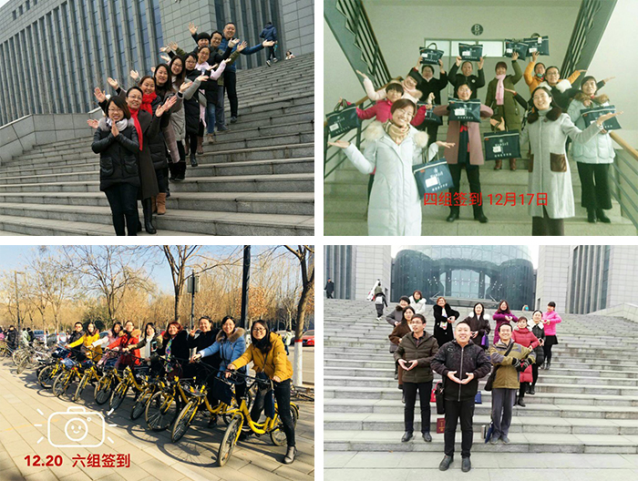 我们改革了传统的签到方式。要求学员每天以小组为单位拍照,并将照片上传到班级QQ群进行签到。旨在刚性纪律和柔性管理相结合, 既保证了出勤率,又活泼有趣。小组签到照学员自己设计,彼此创意不同,同一个小组每天的创意又不同。