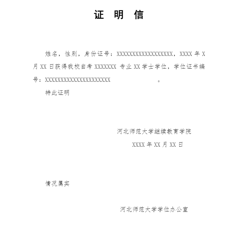 3. 学位证明开具流程:学校档案馆查询学位档案复印有关材料(确定立档人为继续教育学院有关人员 ) → 继续教育学院办公室开具证明(盖章) → 持证明到学位办盖章。证明格式如下: