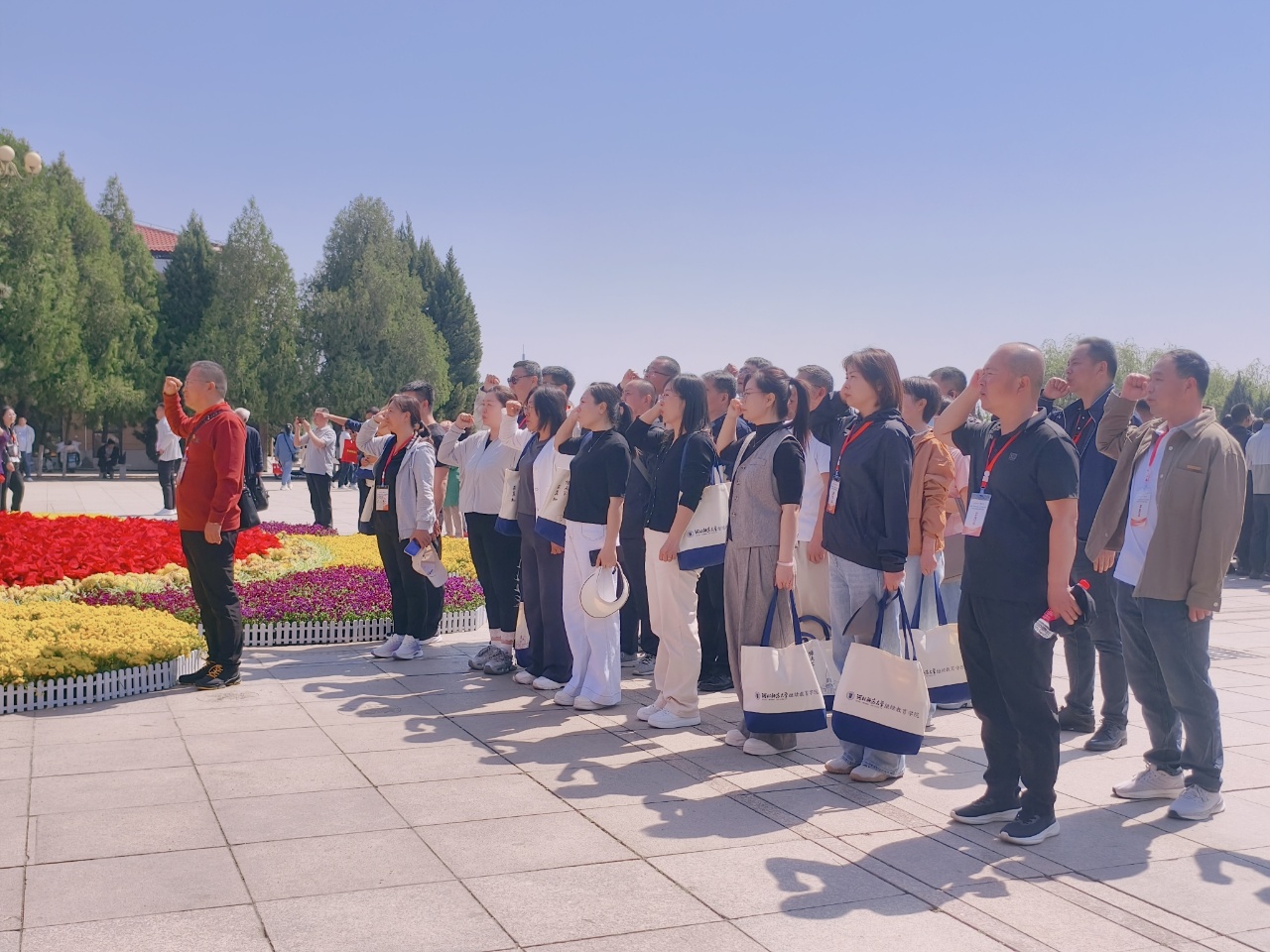 在庄严的西柏坡纪念馆前,全体党员教师整齐列队,举行了重温入党誓词仪式。面对鲜艳的党旗,他们高举右手,目光坚定,声音洪亮而有力地宣誓:“我志愿加入中国共产党……随时准备为党和人民牺牲一切,永不叛党。”铮铮誓言,在西柏坡的上空久久回荡,彰显着党员教师们不忘初心、牢记使命的坚定信念。