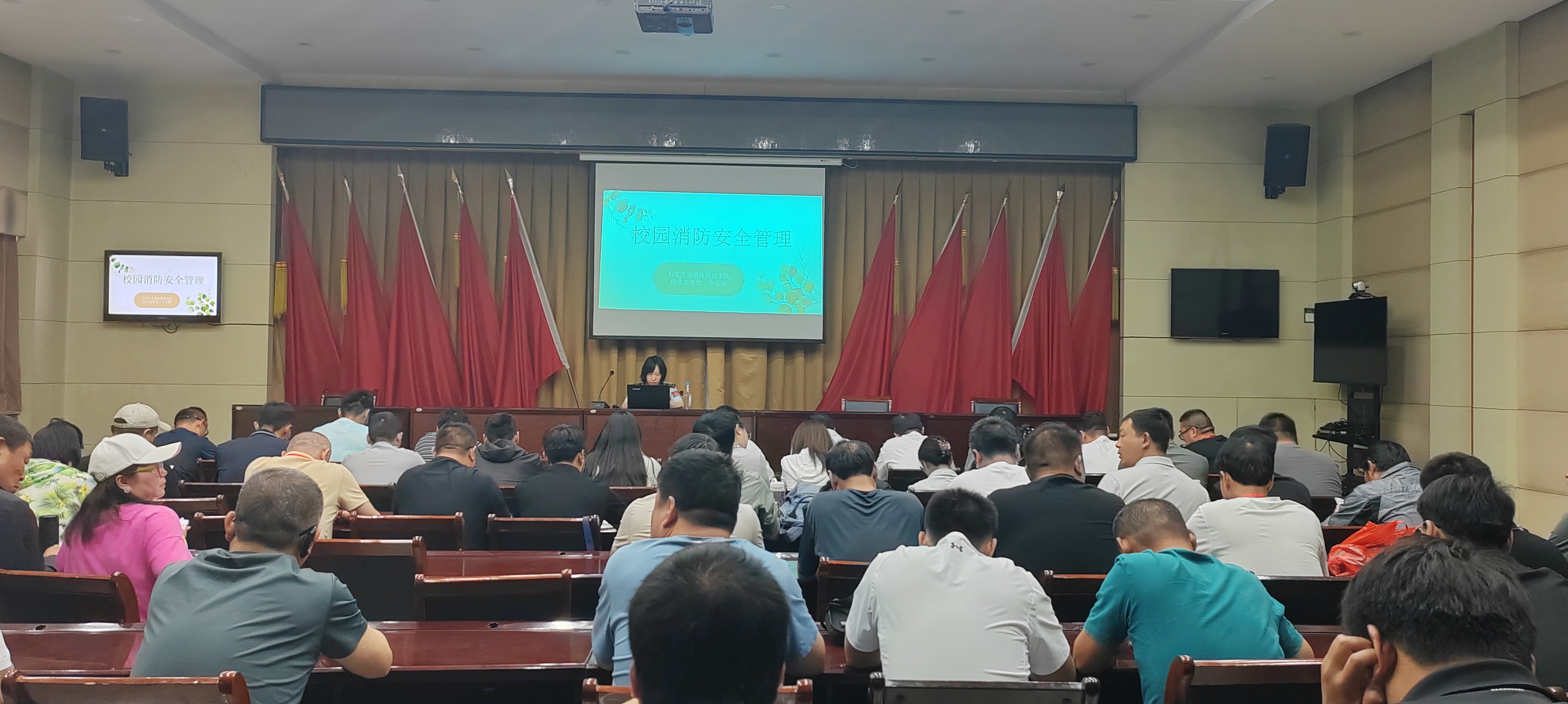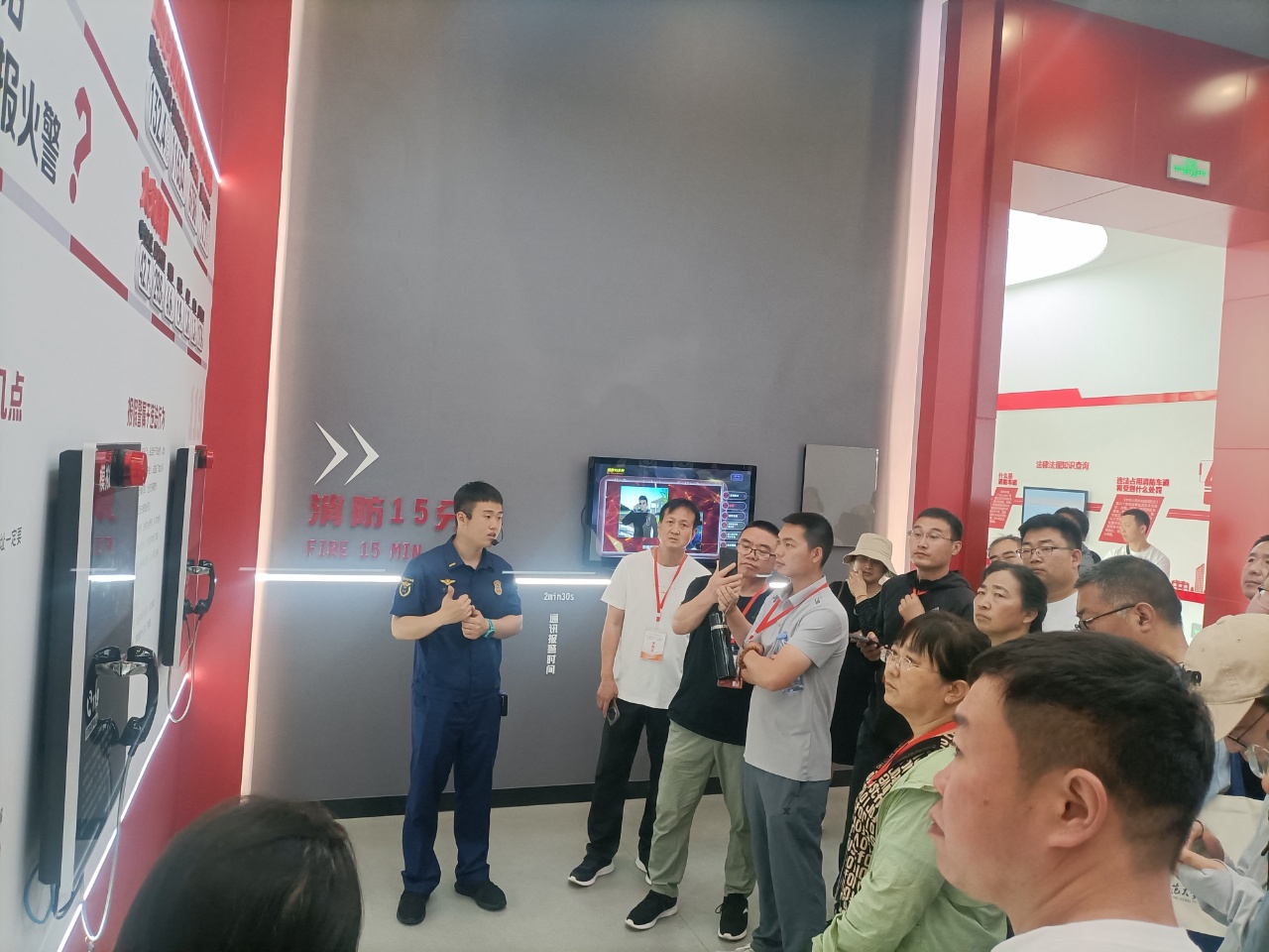 最后,走进消防展馆,学员们开启了沉浸式的消防安全实践课堂。展馆内,逼真的火灾场景模拟装置、互动式消防知识问答屏、地震体验舱等科技设施令人眼前一亮。通过烟雾弥漫的模拟通道,学员们躬身低姿,切身感受火场逃生的紧张与规范;展馆讲解员结合校园常见消防隐患,详细演示了灭火器、消火栓的使用技巧,并指导学员分组进行实操演练。消防专题讲座更让每位骨干教师深刻意识到:只有将鲜活的消防知识与技能带回校园,才能真正做好校园消防安全的防护网。