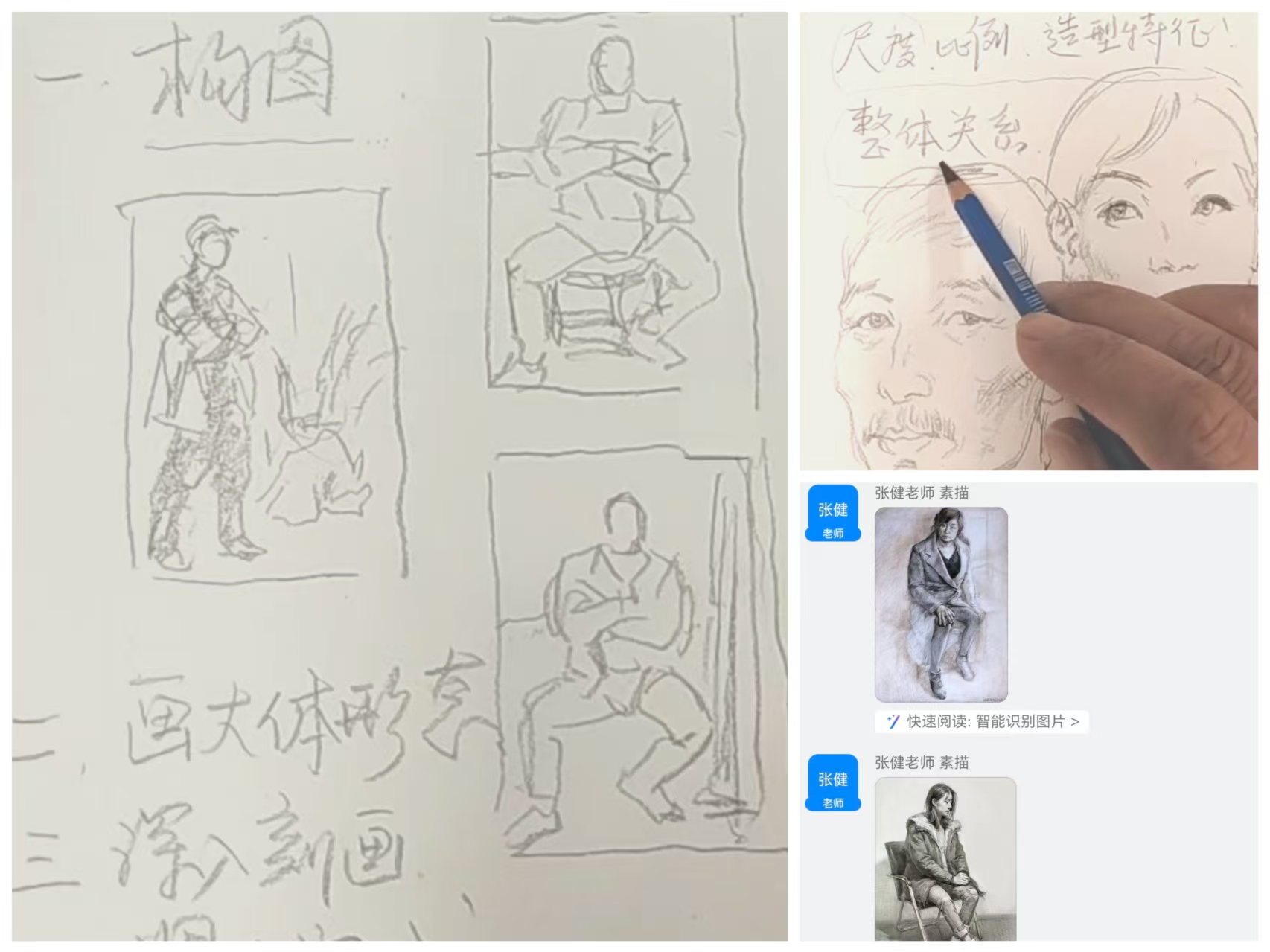 7月6日至7日,河北师范大学美术与设计学院张健老师聚焦素描全身着衣人物课程展开深度教学。课堂上,张老师从人体头像、半身像与全身像的概念辨析切入,结合不同人物特征现场示范五官的多元处理技法,并系统梳理构图、起形、刻画与调整的完整作画流程,以直观教学帮助学生夯实素描基础。