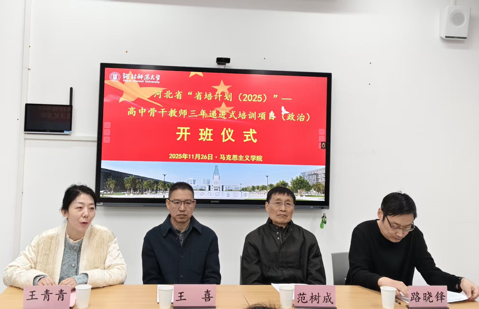 11月26日上午,河北省“省培计划(2025)”高中骨干教师三年递进式培训项目(思想政治)第三期开班仪式在河北师范大学举行。本次培训聚焦高中政治学科教学能力提升,旨在通过三年递进式培养体系,打造一支政治素养过硬、教学功底扎实、创新能力突出的骨干教师队伍,为河北省思政教育高质量发展注入新动能。开班仪式由河北师范大学马克思主义学院院长助理王青青主持,河北师范大学继续教育学院院长王喜、马克思主义学院副院长路晓锋、政治学科首席专家范树成、业务班主任周淑萍,行政班主任冯胜刚出席仪式。
