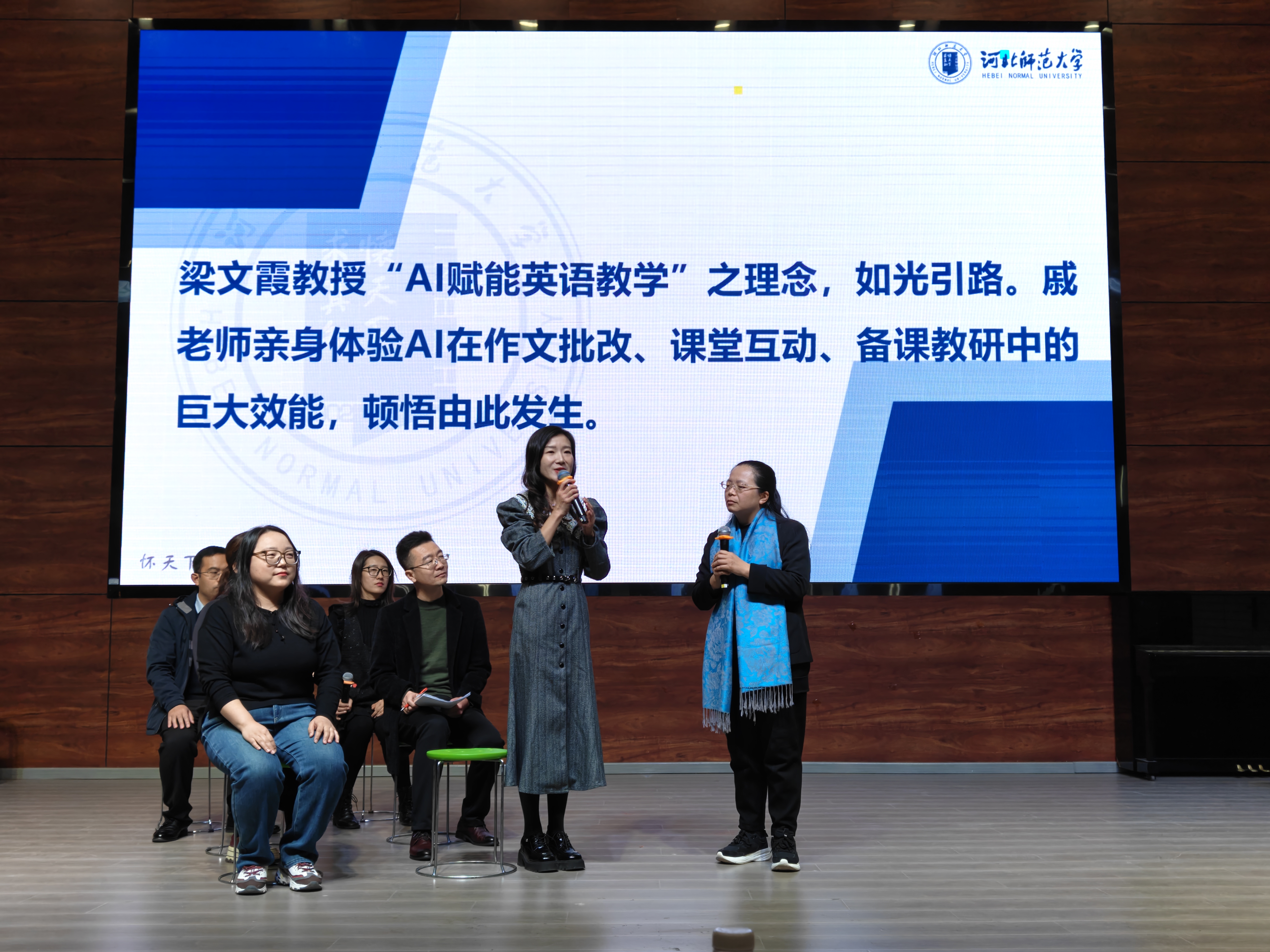 在学科成果展示环节,九个承办学院依次登台,以情景剧、诗朗诵、教育叙事、主题汇报、短剧等丰富形式,生动呈现了三年来的成长轨迹与育人智慧。政治学科以《红色领航思政铸魂》展现了立德树人的使命担当;生物学科深情讲述了《三载育禾,一生向阳》的成长故事;文学院以诗朗诵《向光而行,感恩相遇》抒发了对导师与同窗的深厚情谊;化学学科的《“变化之学,创造之美”》、数学学科的《启航》、地理学科的《经纬之间:从课堂到课题的蜕变旅程》、物理学科的《师路.冀忆.启新程》分别通过课堂重构、课题研究、教育戏剧等形式,展示了在教学创新、科研融合与专业升华方面的扎实成果;历史文化学院项目管理班主任刘京京老师以《为历史教育强基,为骨干教师赋能》为题,系统汇报了项目设计的逻辑与实施路径;外语学院则通过情景剧《成长“戚”遇记》,生动演绎了人工智能与英语教学融合的探索历程。