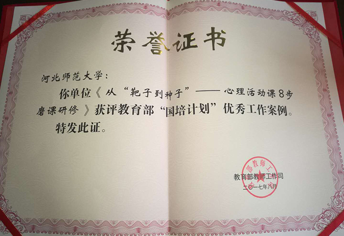 2012年至今,我校先后有心理健康教育、高中数学、初中生物、小学科学、法制教育5个学科承担“国培计划”示范性项目的培训任务,有来自全国的714名中小学骨干教师到我校培训学习。这些示范性培训项目,是我校重点打造培植的教师培训品牌,2015年承担的高中数学骨干教师培训项目在同项目参训学员网络匿名评估中取得综合排名第一的好成绩。心理健康教育学科通过实践探索、总结提炼的“从靶子到种子”--- 心理活动课8步磨课研修”培训方法,2016年被教育部收录为优秀国培案例。所有这些,都为“国培计划”中西部项目和幼师国培项目的开展提供了宝贵的经验。