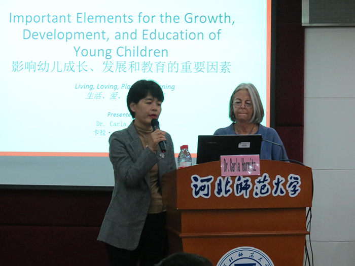 耶鲁大学凯文山日托幼儿园荣誉退休园长卡拉· 霍维茨博士为幼儿园园长国培班讲座“影响幼儿成长、发展和教育的重要因素”